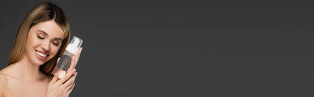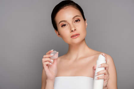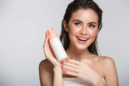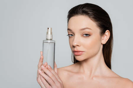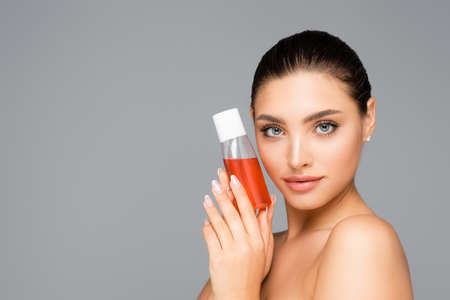 brunette young woman with bare shoulders holding bottle with cosmetic product isolated on grey