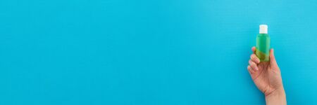 Top view of a medical disinfectant or antiseptic. A man is holding a green antibacterial agent with aloe in his hand. Isolated on a blue background, banner with copy space for text