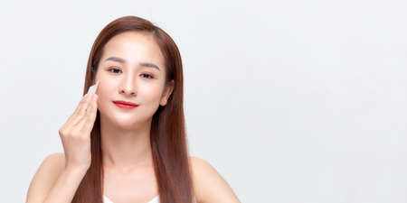 Healthy fresh girl removing makeup from her face with cotton pad. woman with a sponge wihte background cotton pad problem skin