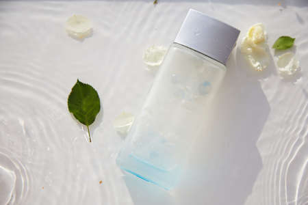 Plastic cosmetic bottle with foam on water surface, idea for branding mockup of cosmetic product