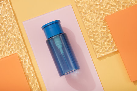 Top view of an empty bottle mockup makeup remover decorated with colorful acrylic sheets on beige background. Minimal art background with copy space for cosmetics product presentation