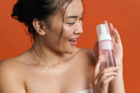 Brunette asian woman with naked shoulders pouring face foam on finger isolated on brown