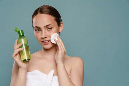 Ginger woman wearing towel cleaning her face with face lotion isolated over blue background