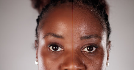 Transformation of a black woman's skin before and after a microdermabrasion facial treatment, showcasing the power of skincare.