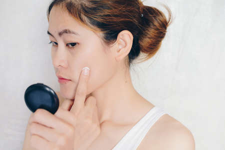 Close up of young Asian woman applying moisturizer cream on her face. Conceptual of beauty and skin care.