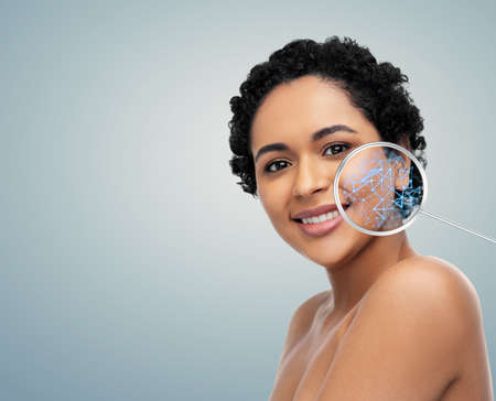 Beauty portrait of young african american woman applying cosmetic cream on face.