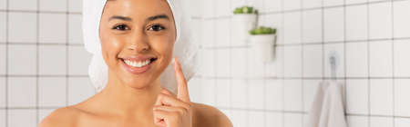 young african american woman applying cream on face with finger in bathroom, banner