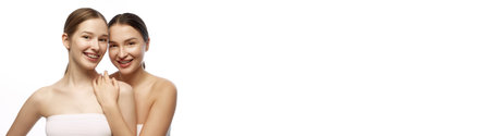 Banner. Young beautiful women with bare shoulders looking at camera against white background with negative space to insert text. Concept of female health, youth, skin care, cosmetic products, wellness