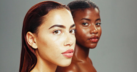 Studio, portrait and skincare for women, shine and treatment for glow, confident and cosmetics for antiaging. Grey background, inclusion and dermatology for exfoliation of skin, friends and people