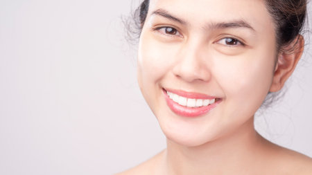 Beautiful Attractive Charming Asian young woman smile with white teeth and touching soft cheek feeling so happy and cheerful with healthy skin,isolated on white background,Beauty Cosmetology Concept