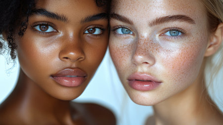 Two diverse women with naked shoulders standing behind of each other