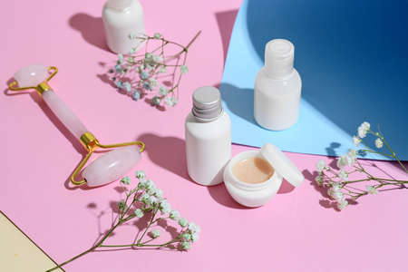 Different cosmetic products, facial massage tool and gypsophila flowers on color background