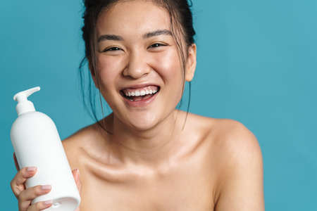 Beauty portrait of a smiling topless young asian woman posing while standing isolated over blue background, showing blank plastic bottle