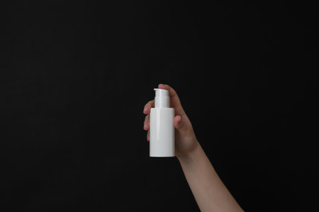 White cosmetic cream tube in hand on a black background. Presenting luxury skincare products.