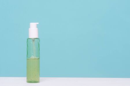 Bottle of blue cosmetic gel on light background, top view. Space for text