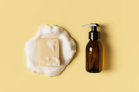 Liquid and bar natural eco soap lat lay on yellow background, copy space, top view