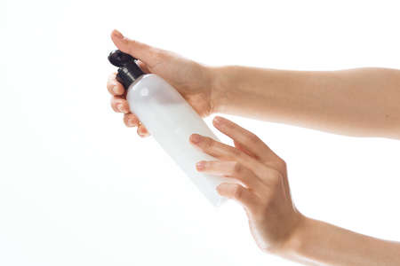 Close-up of white bottle with antiseptic liquid. Disinfecting thing for people. Flask for personal hygiene. Prevention spread. Handover and health concept