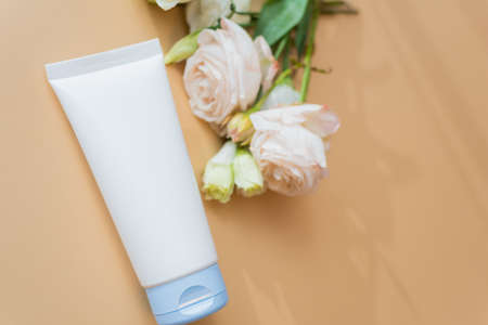 Cream and lotion in white tubes on a beige background with flowers of roses. Cosmetic products for skin care from natural ingredients.