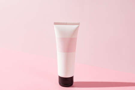 mockup of white squeeze bottle plastic tube for branding of medicine or cosmetics - cream, gel, skin care, toothpaste. Cosmetic bottle container on a pastel pink background. minimalism.