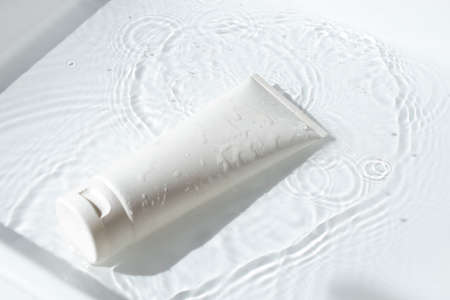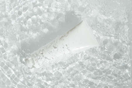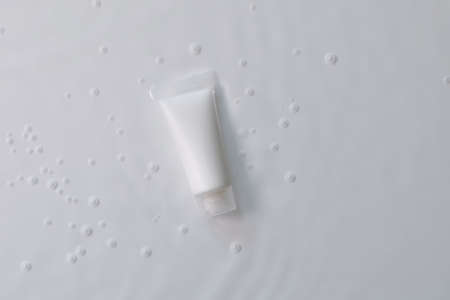 Flat lay flatlay top above overhead view photo of blank empty white tube for cream isolated over background with water drops