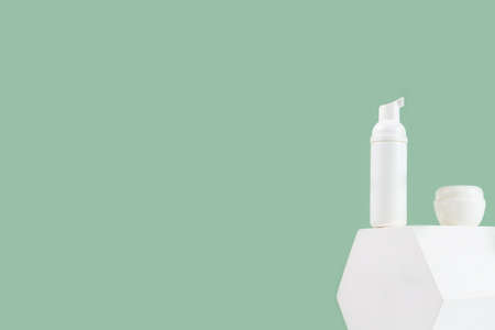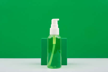 Green gel or foam for face skin cleaning on white table against green background with copy space.