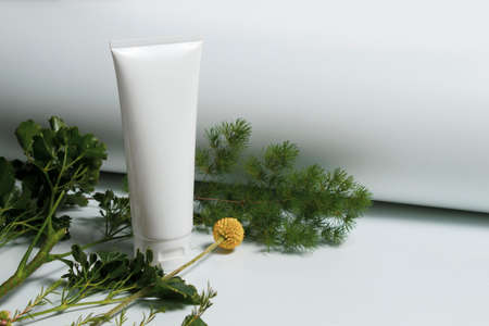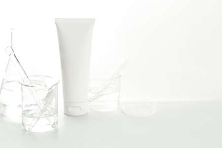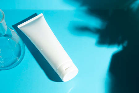 fresh beauty spa medical skincare and cosmetic lotion cream facial tube bottle packaging product on white decor background with summer season sun light