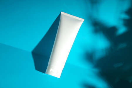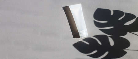 Plastic tube for cream or lotion on a gray background with shadow of montera leaves. Beauty concept