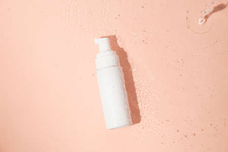beauty spa medical skincare and cosmetic. lotion dispenser bottle mock up cream packaging product on white water background with drops, summer fresh concept.