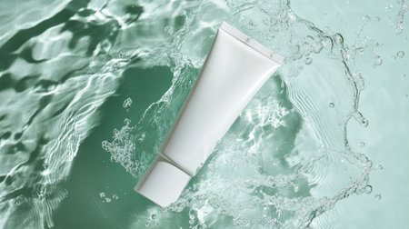 Top view of a cosmetic cream tube submerged in water on a pale green backdrop, emphasizing purity and natural beauty