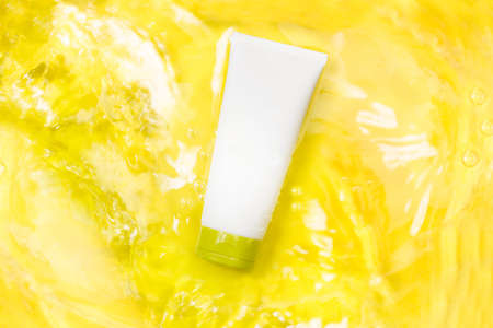 Moisturizer cream soft tube over the water on a yellow background in a top view