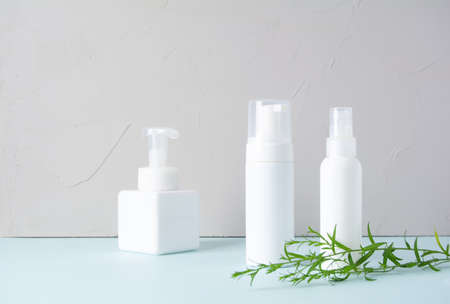 Cosmetic bottle containers packaging with product display presentation, Blank label for organic branding mock-up, Natural skincare beauty product concept.