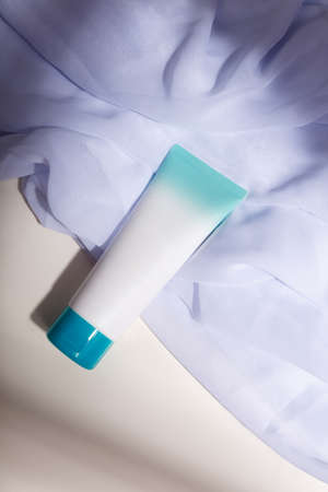 Plastic white tube for cream or lotion on light fabric background. Skin care cosmetic presentation with daylight and beautiful shadow. Beauty concept for face body care.
