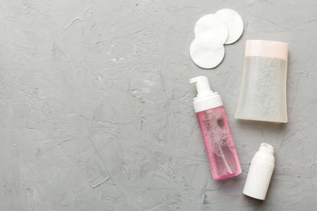 Micellar cleansing water and discs to remove cosmetics and cleanse the skin on colored background. Copy space top view.