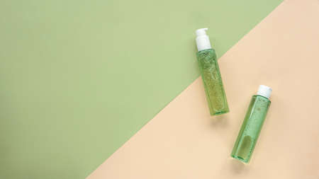 Two green cosmetic bottles with face washing gel and tonic on beige and green background. Natural organic cosmetics. Top view, flat lay