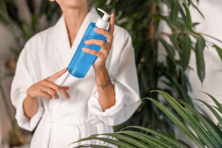 Cropped shot of woman holding a blue bottle with skin care product, gel wash while standing in bathroom decorated with plants