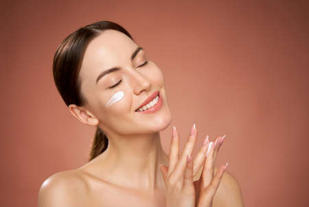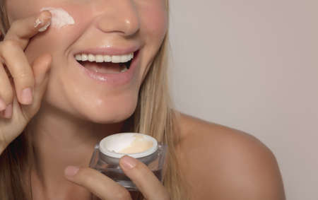 Close-up portrait of attractive young woman using anti-age cream and posing in the studio.