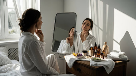 A woman looks in a mirror, possibly examining her skin or applying skincare. Soft lighting illuminates the scene, highlighting the textures of her clothing and the room. Various bottles and containers sit on a table, suggesting a focus on health or cosmetic practices. This image could be used for articles, advertising, or related visual content.