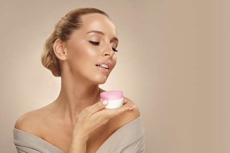 Female beauty model looking away, holds near her face natural eco safety cream on beige isolated, close up portrait with free copy space.