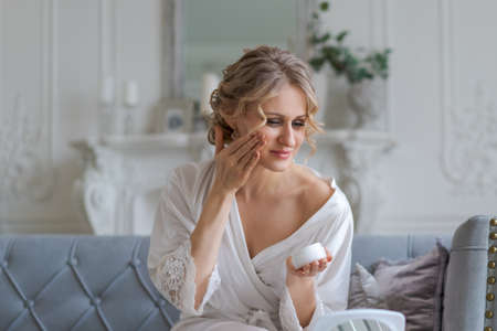Beautiful young woman well caring healthy skin applies cream wears bathrobe poses on sofa doing facial beauty treatments at home in the living room in the morning