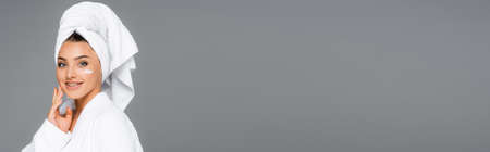 smiling woman with towel on head and cosmetic cream on face isolated on gray, banner