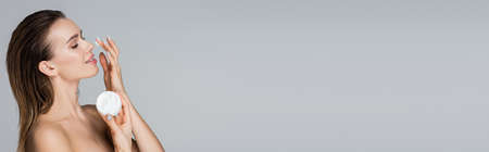 side view of smiling woman with closed eyes applying face cream isolated on grey, banner
