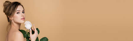 pretty young woman with white rose looking at camera isolated on beige, banner