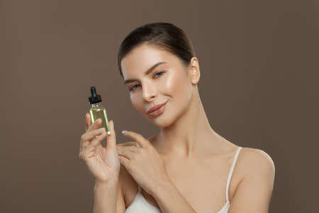 Pretty woman with natural oil bottle. Facial treatment and alternative medicine concept