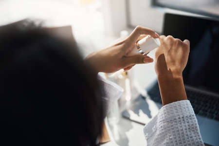 Women's hands apply cosmetic moisturizing cream lotion on white table. Natural cosmetics. Feminine beauty blog concept template