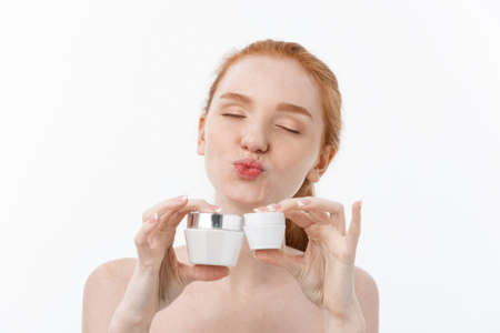 portrait of beautiful woman smiling while taking some facial cream isolated on white background with copy space.