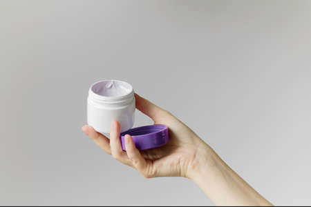 A woman holds a jar of clear hand cream. The concept of skin care. Close-up of women's hands holding a jar of cream