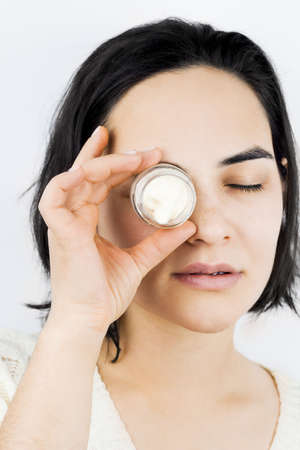 Close-up portrait of attractive young woman using anti-age cream and posing in the studio.