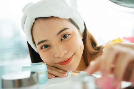 Close up portrait of young asian dark hair woman with cosmetic skin care on table.