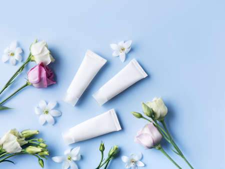 A set of cosmetic products in white tubes with empty space for labeling. Cosmetics for face and body skin care. Moisturizing cream, purifying mask.