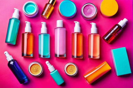 A colorful array of makeup products, including a brush, a bottle of lotion, and a jar of powder